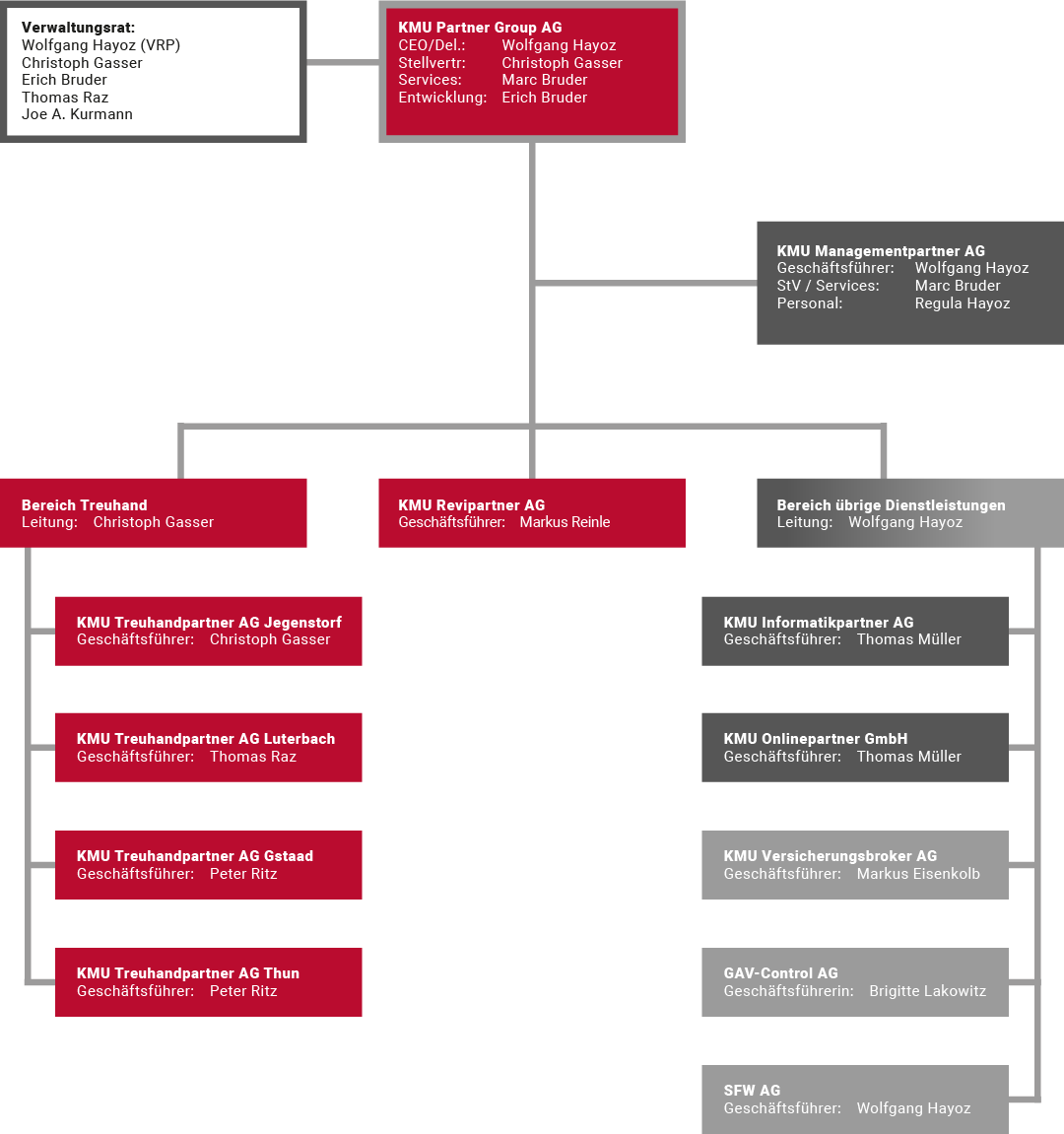 Weil Erfahrung in der Beratung unersetzlich ist, legen wir hohen Wert darauf, dass unsere Führungspersonen selbst als Unternehmer agieren. Unser Modell fasst operativ weitgehend eigenständige Firmen unter einem gemeinsamen Holdingdach zusammen und ermöglicht so optimale Voraussetzungen. KMU für KMU.
